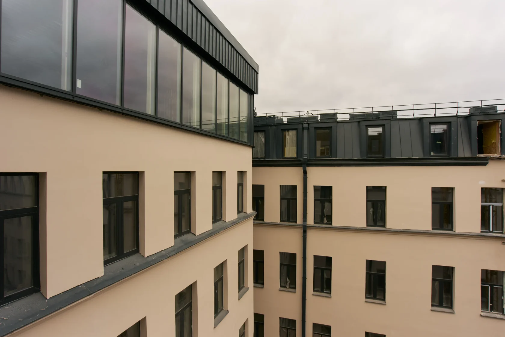 Фасадная часть состоит из квартир для постоянного проживания с отельным обслуживанием 24/7, а дворовая часть (4 парадная) это 4* бутик-отель и инвестиционные квартиры студии.